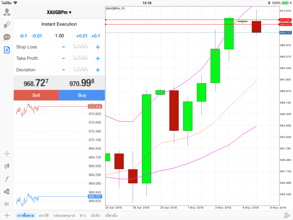 จากภาพเป็นกราฟ ไทม์เฟรม 1 วัน D1 โดยมีจุด Sell อยู่ที่ 960.727 และ Buy อยู่ที่ 970.998