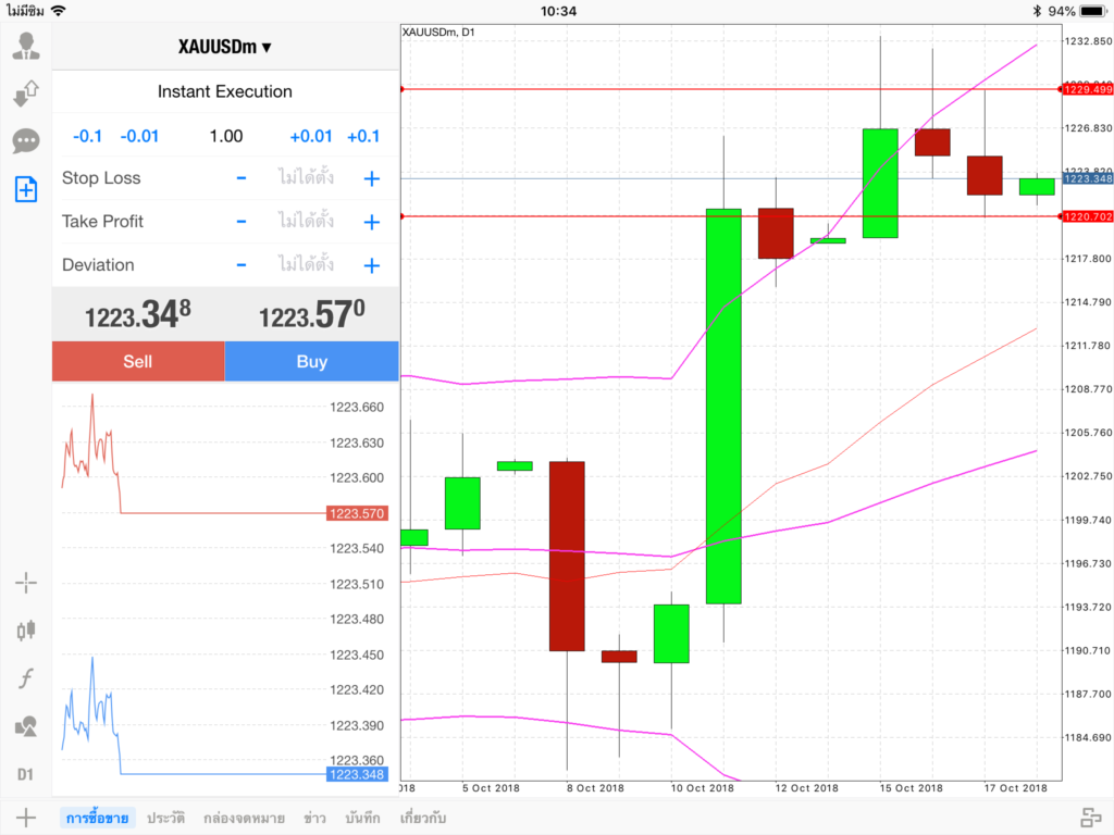 จากภาพเป็นกราฟ ไทม์เฟรม 1 วัน D1 ราคาทองสหรัฐ XAUUSD โดยมีจุด Sell อยู่ที่ 1223.348 และ Buy อยู่ที่ 1223.570
