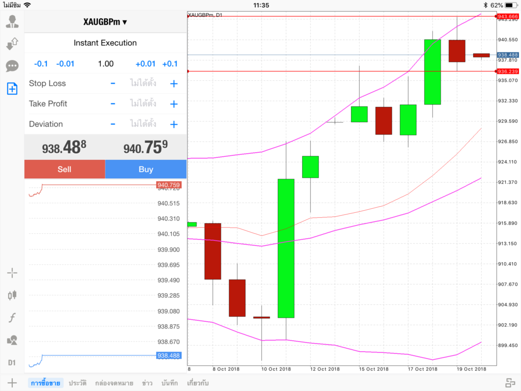 จากภาพเป็นกราฟ ไทม์เฟรม 1 วัน D1 ราคาทองอังกฤษ XAUGBP โดยมีจุด Sell อยู่ที่ 938.488 และ Buy อยู่ที่ 940.759