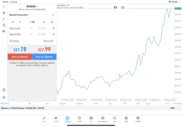 การเทรด Crypto BCHUSD 1.00 lot จะเริ่มขึ้นแล้ว หลังจากนักลงทุนกรอกจำนวน lot แล้วคลิ๊กปุ่ม Sell by market หรือ Buy by market การเทรดจะเริ่มขึ้น