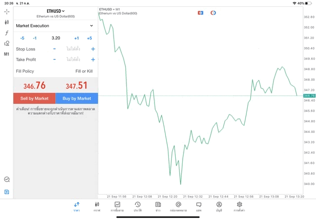 การเก็งกำไร Crypto ETHUSD 3.20 lot จะเริ่มขึ้นแล้ว หลังจากนักลงทุนกรอกจำนวน lot ที่ต้องการเทรดแล้ว คลิ๊กปุ่ม Sell by market หรือ Buy by market การเทรดจะเริ่มขึ้น