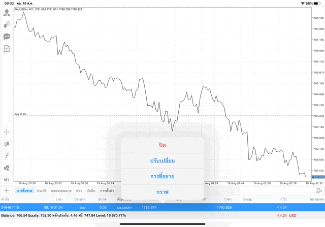 การลงทุนทอง 0.05 lot จะเริ่มขึ้นแล้ว หลังจากนักลงทุนกรอกจำนวน lot ที่ต้องการเทรด แล้วคลิ๊กปุ่ม Sell by market หรือ Buy by market การเทรดจะเริ่มขึ้น